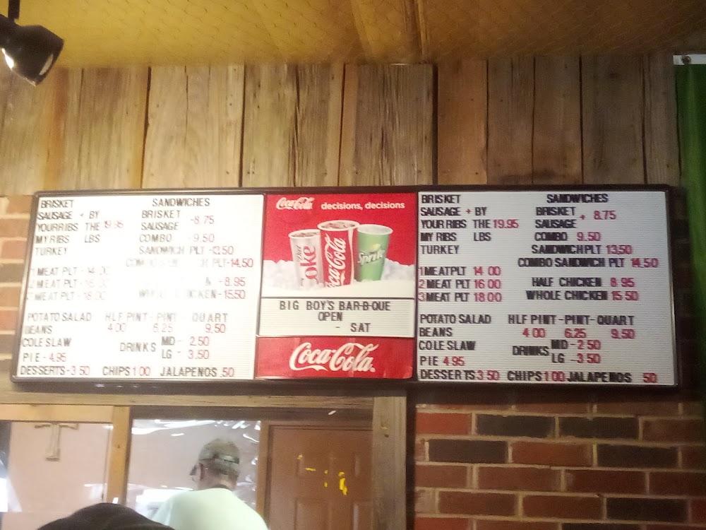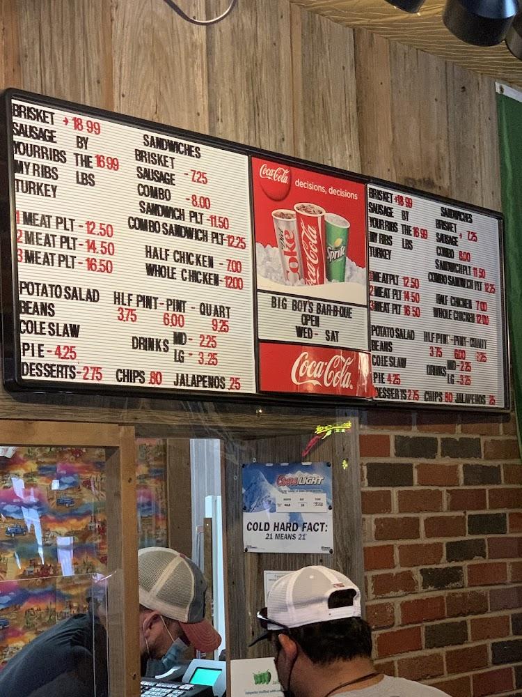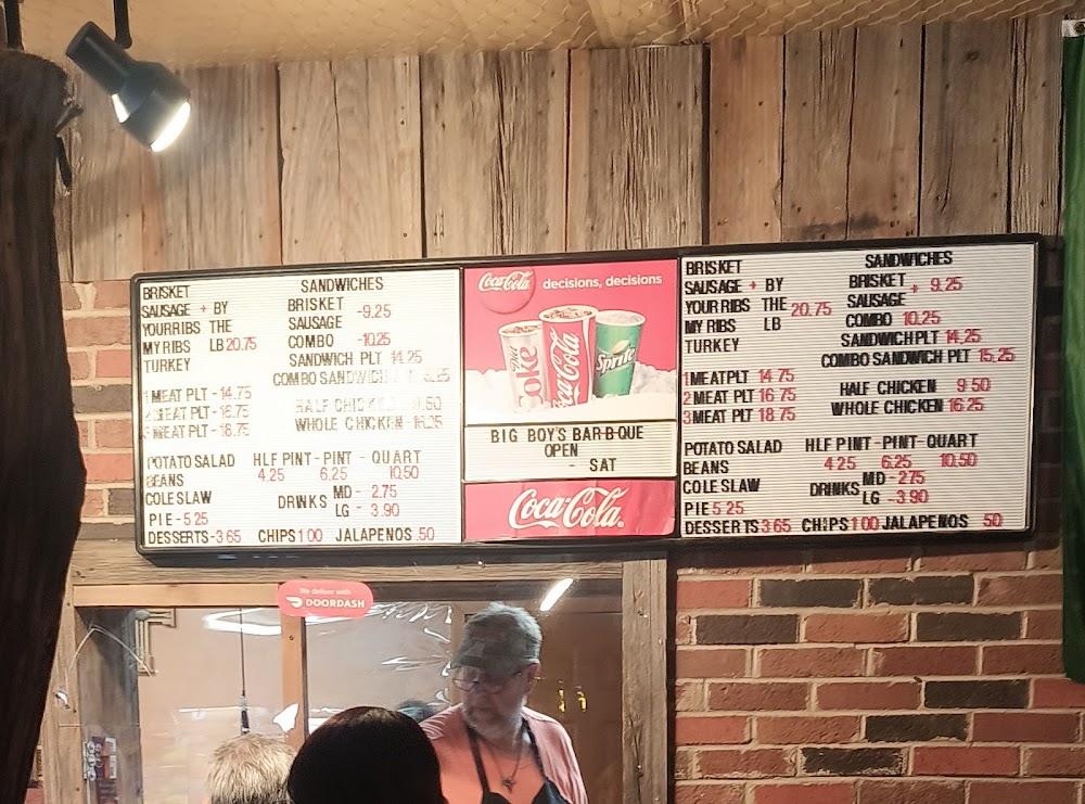 The menu at Big Boys Bar-B-Que showcases a variety of smoked meats. Highlights include combo sandwiches, brisket by the pound, and three-meat plates. Each dish comes paired with a choice of two sides, enhancing the meal. Side options feature classic potato salad and zesty coleslaw. Drinks range from refreshing beverages that suit all tastes. Prices remain wallet-friendly despite generous portions. Big Boys ensures great BBQ without compromising quality.